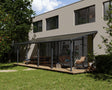 The Olympia Patio Cover features a durable, corrosion-resistant aluminum frame with a gray powder-coated finish and virtually unbreakable bronze twin-wall polycarbonate roof panels. It offers 100% UV protection, making it a stylish and long-lasting addition to your outdoor living space.