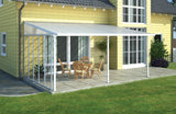 Protect yourself and your patio with the Feria patio cover. The UV-protected, clear polycarbonate roof panels shield against harsh rays while allowing sunlight through. The white powder-coated aluminum frame resists rust and matches any home color, and the adjustable frame fits various patio sizes.